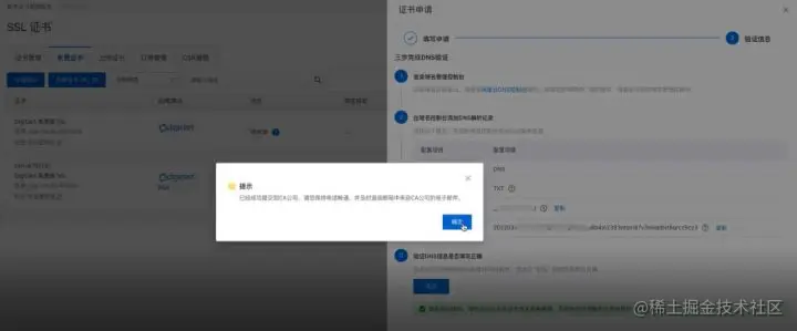 此时阿里云会生成几个验证DNS的信息,包括“记录类型”、“主机记录”和“记录值”,我们需要对这几个信息都熟悉(下一步验证过程中会使用到)。其中,记录值最好复制好备用,再点击页面下方的“验证”按钮,向阿里云发出验证申请。