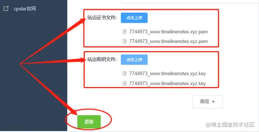 在编辑页面,我们分别将站点证书文件和站点密钥文件上传(此处需要注意,站点证书文件的后缀名为.pem;而站点密钥文件的后缀名为.key,这两个文件不可弄混。