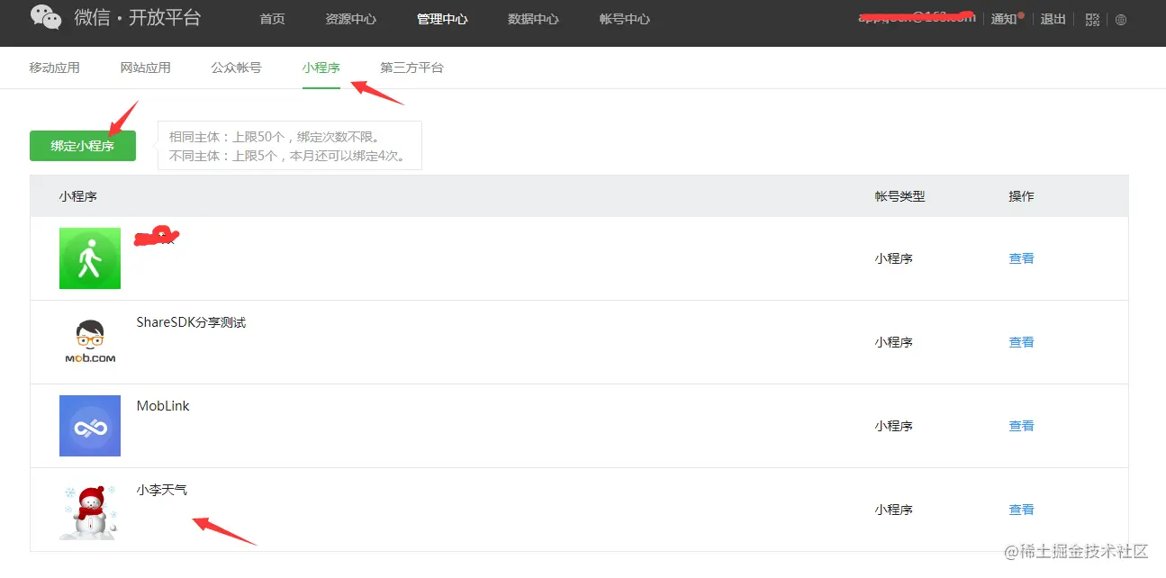 集成完之后做小程序的分享,首先需要申请完小程序到微信开放平台绑定到自己的应用,否则无法成功分享,绑定的位置参考下图: