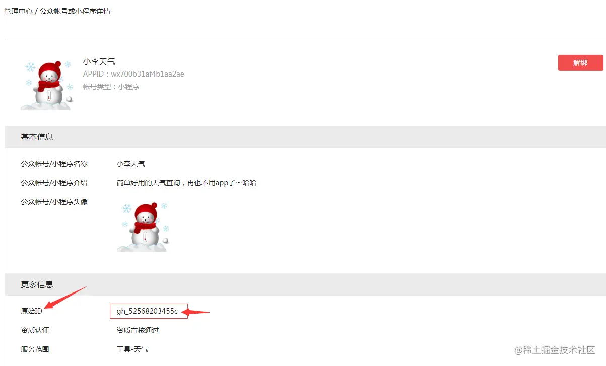 绑定完之后点击查看如下图所示可以看到原始ID,这个后面分享会用到;
