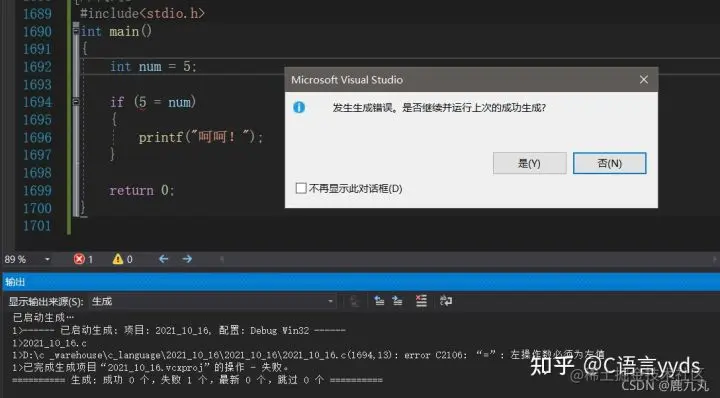 在这种情况下,如果我们还是按照错误的方法去写,很明显程序就报错了,为什么会报错呢?我们只能给变量赋值,即我们书写赋值语句的时候,=左边必须是变量,而不能是常量!这样编译器一旦提示我们程序错误,我们一检查,就知道自己又犯了老错误,就能及时更正过来!所以推荐大家在写if()里面的条件判断表达式时,将常量放在关系运算符的左边!