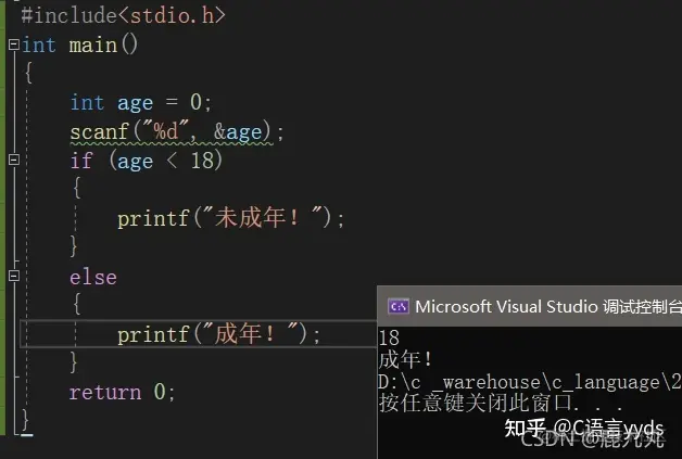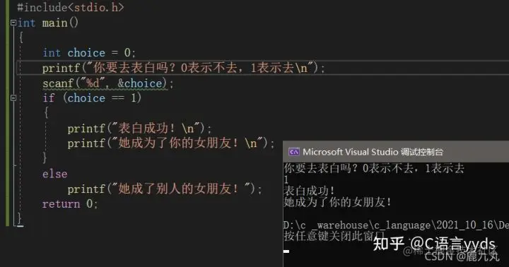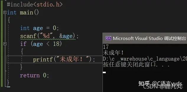 看到这很多同学们又有问题了,那我们在if()的后面直接跟一个变量是不是也是可以的呢?是的,完全没有问题!因为上面已经说了,c语言规定,0为假,非0为真,所以在if()后面直接跟变量是完全没有问题的! 如果变量值为非0,那么判断结果为真,就执行后面的语句,如果变量值为0,那么判断结果为假,就不执行后面的语句。