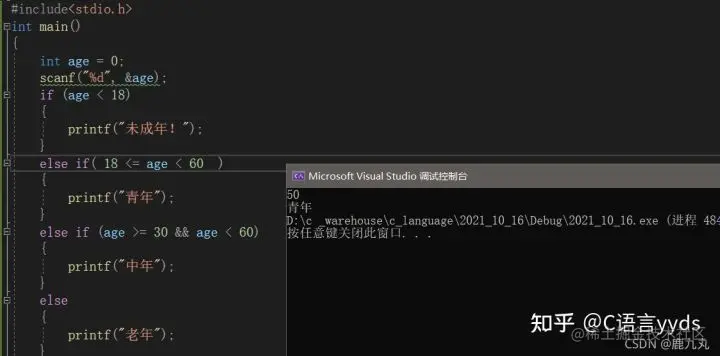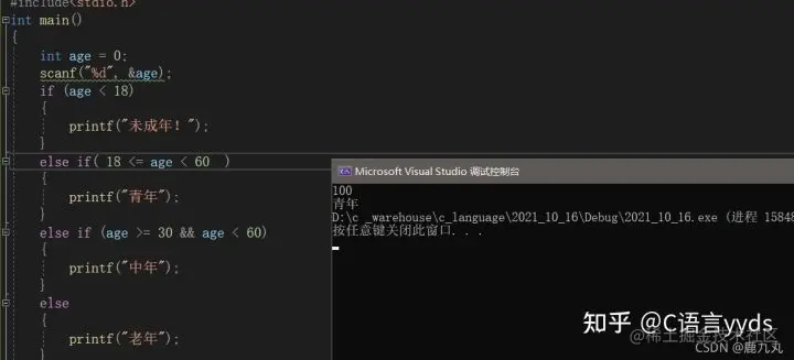 在同学们看到第一张图的时候,哎,感觉没问题啊,但看到第二张图的时候,出问题了!为什么会出现这种问题呢?接下来呢,我给大家分析一下! 我们知道,> >= < <= == ,这些运算符都是关系运算符,如果结果为真,就返回1,如果结果为假,就返回0,并且结合方向是自左向右 (有关于运算符的结合方向,我会把各种运算符的结合方向以图片的形式在本篇文章的最后分享给大家) ,在第二个例子中,我们输入了100,首先对第一个if后面的表达式进行判断,很明显,100>18,不满足条件,接下来进入了第一个else if语句进行判断,18<=100,是真的,返回1,然后1<60,是真的,最终,返回1结果是成立的,所以会输出“青年”,相信大家看到这就明白了,在计算机中是不可以这样写的,虽然语法上没有问题,但逻辑上却无法正确表达我们的意思,无法满足我们的要求,所以不要这样使用!
