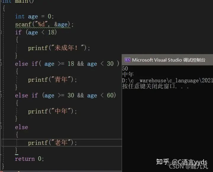 哎,很多同学们看到这就想问了,多分支情况下后面的条件判断是不是不写前面的age>=18也是可以的呢?很明显当然是可以的,因为前面不满足age<18的时候此时age是一定大于18的了,那么此时按照道理来说,我们不写age>=18也是没有问题的,但这个地方,推荐同学们还是要加上的,为什么呢?我们将来写代码,不仅仅是给自己看的,也是要给别人看的,加上之后,条理就很清晰明了,方便别人查看的同时,也有利于我们后期的维护与调试。