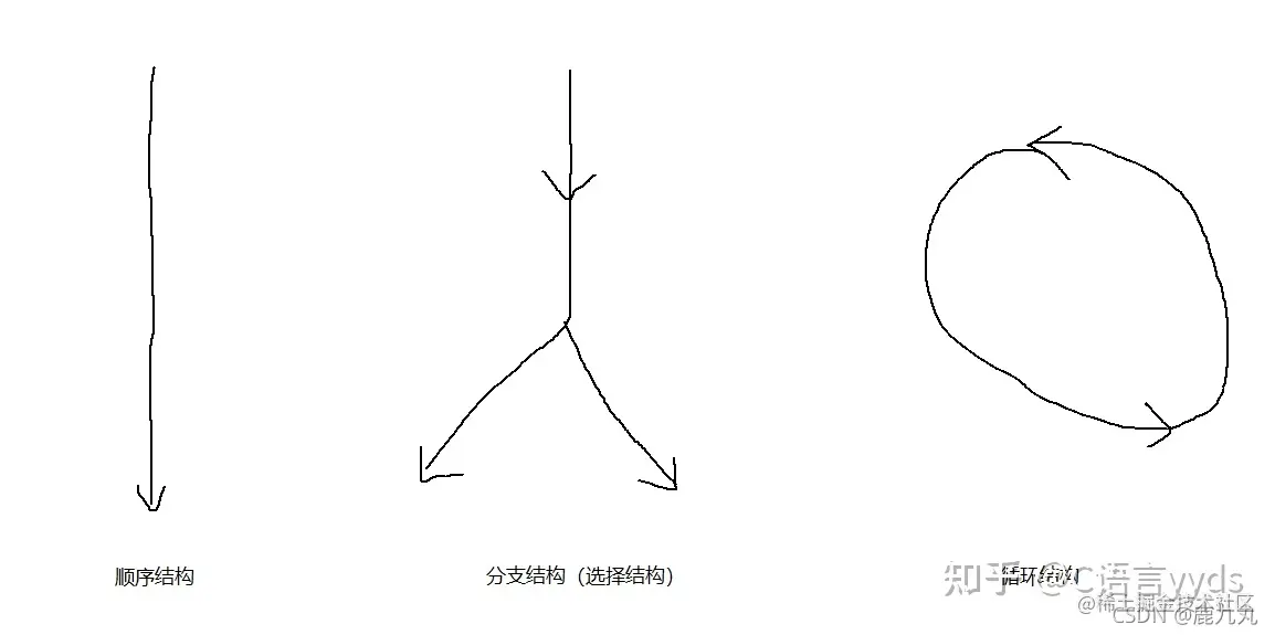 这个图画得确实不是很好,但我觉得大家应该能了解到我的意思,这三种做事或者解决问题的方法,也分别对应着C语言中的三种结构(不得不感叹最初编程设计语言的抽象概括能力),这个地方需要告诉大家,C语言中也只有这三种结构,而我们今天讲的也就是分支和循环语句,对应的也就是分支和循环结构,那么我为什么不讲顺序结构呢?