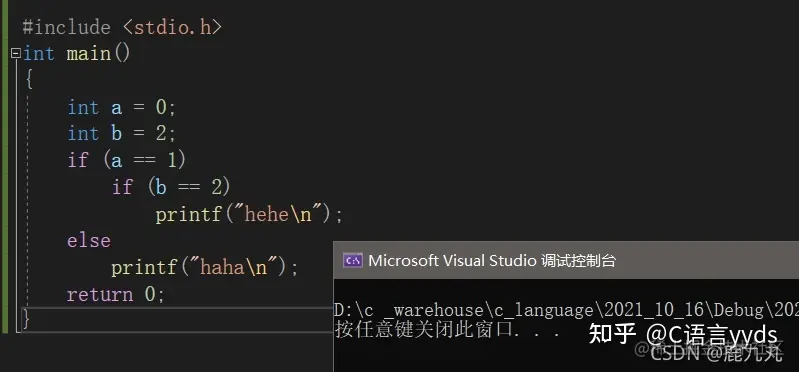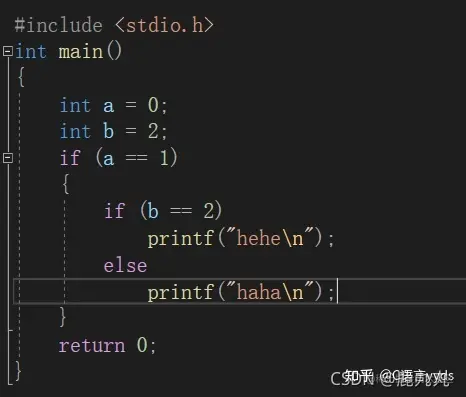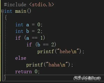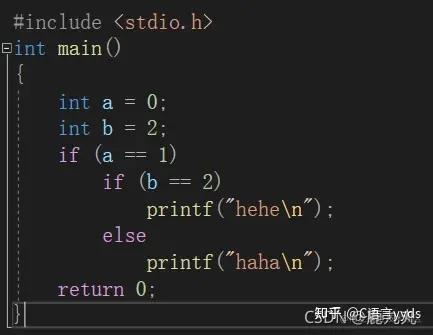 首先只看这张图的话,很容易让人误解后面的这个else会跟if(a==1)进行匹配,但是我们应该记住else符合就近原则,即总跟最近的未配对的if进行匹配,从这个else向前找前面的if语句,首先找到的一个未配对的if语句是if(b==2),相信大家清楚了这个这个就不难理解了,下面给大家展示一下代码的本来面目!