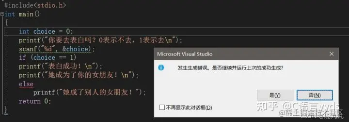 如果条件成立,要执行多条语句,则应该使用代码块!事实上,我前面就全部都使用代码块了,那么什么是代码块呢?C语言中,被{}括起来的叫做代码块,接下来给大家代码展示一下,如果不用{}会怎样!