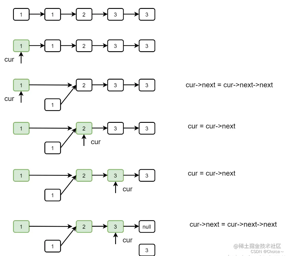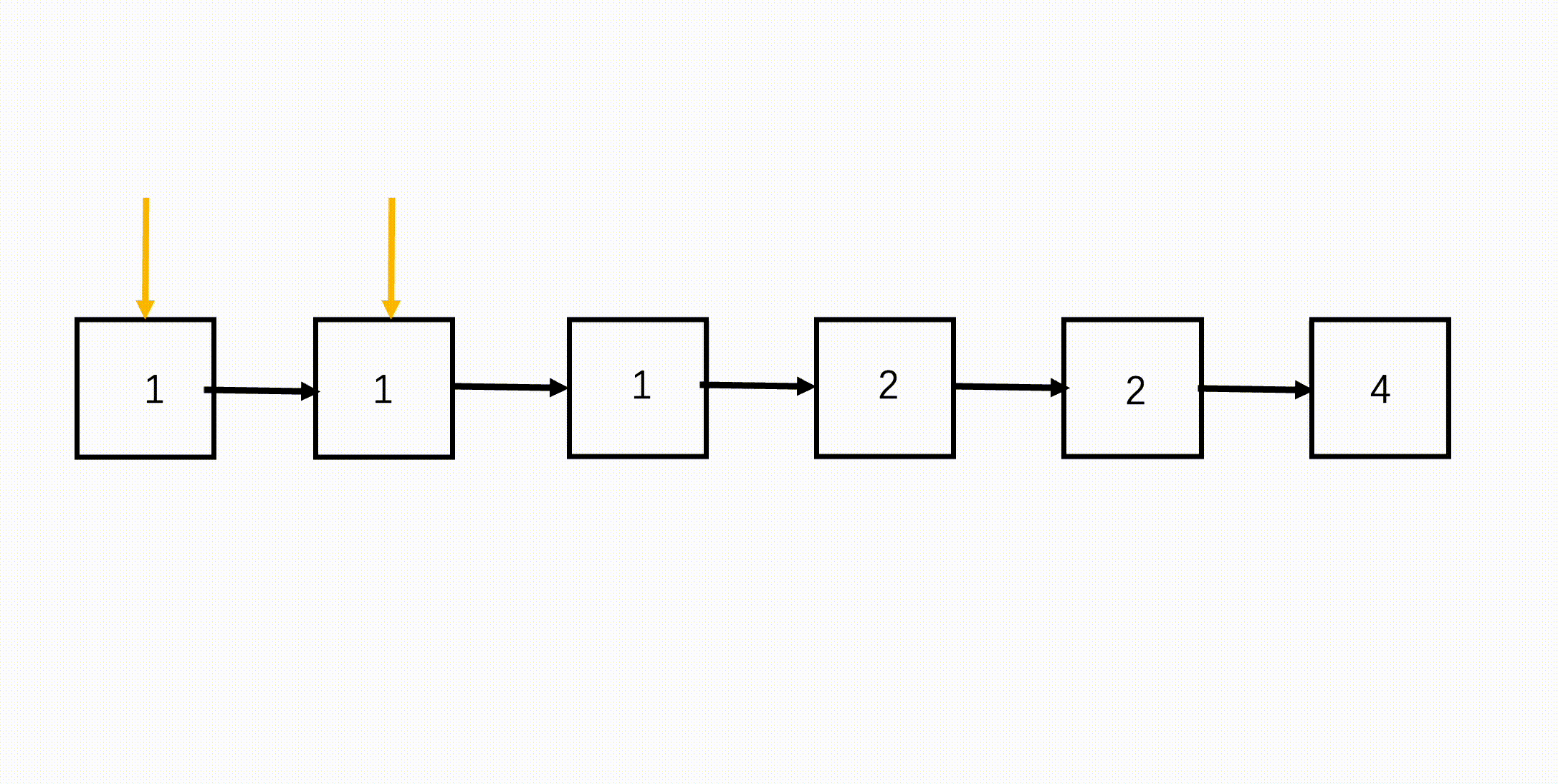 - step 2:使用一个指针遍历链表,如果指针当前节点与下一个节点的值相同,我们就跳过下一个节点,当前节点直接连接下个节点的后一位。