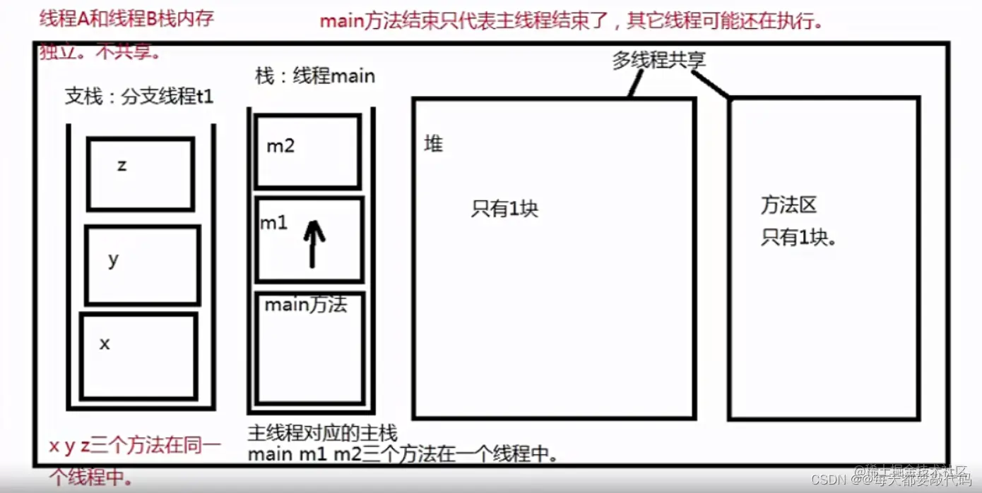 main方法结束只是主线程结束了,主栈空了,其它的栈(线程)可能还在压栈弹栈。⭐️我们通过画图理解一下:
