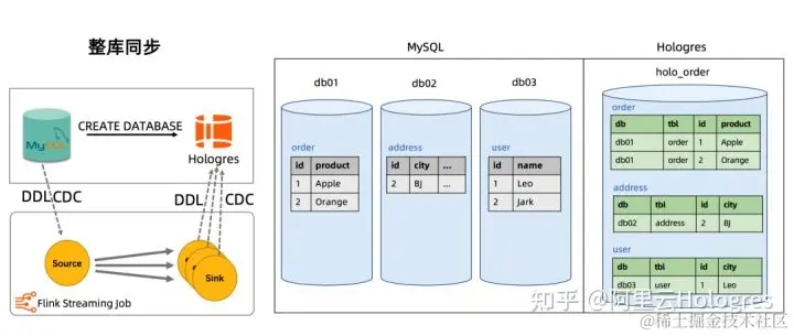 例如 MySQL Catalog 和 Hologres Catalog 配合 CDAS 语法,可以完成 MySQL 到 Hologres 的全增量数据同步。CDAS 语句会解析成一个 Flink 作业执行,这个 Flink 作业自动解析源表的表结构及相应的参数,并将指定的一个或多个数据库同步到下游 Hologres 数仓中,整个过程用户无需手写 DDL 语句,无需用户在 Hologres 提前创建表,就能快速实现数据的整库同步。