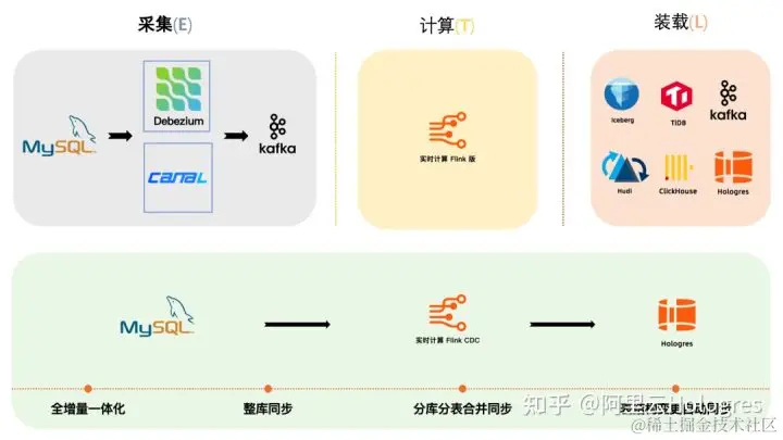 在构建实时数仓的过程中,数据采集是必需的组件。在传统的 ETL 架构里,采集层国外用户通常选择 Debezium,国内用户则习惯用 DataX 和 Canal,采集工具负责采集数据库的全量数据和增量数据。采集到的数据会输出到消息中间件如 Kafka,然后通过 Flink 计算引擎实时消费消息中间件数据做计算层的数据清洗和数据加工,加工完成后再写入目的端(装载层),通常是各种数据库、数据湖和数据仓库。在传统 ETL 链路中,数据采集工具与消息队列是比较重的组件,可能维护在不同的团队,在上游的数据源有业务变更或者这些组件需要升级维护时,整个链路的维护成本会非常大。