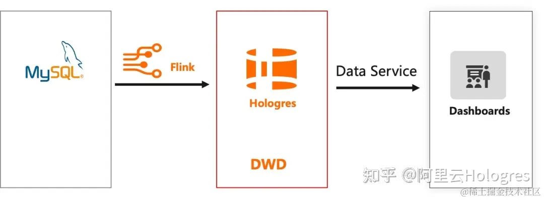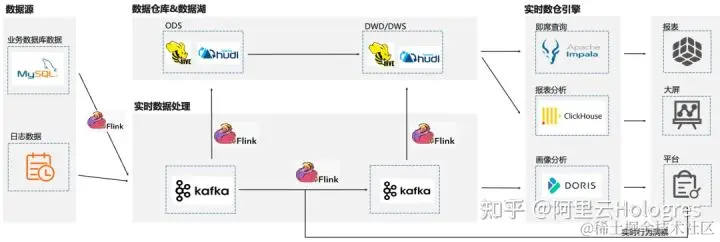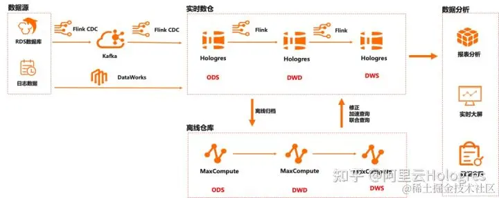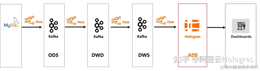 通过阿里云 Flink+Hologres 替换后的数据链路如下: