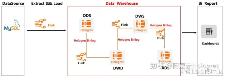 ETL( Extract-Transform-Load)是比较传统的数据仓库建设方法,业务库的数据 Binlog 经过阿里云 Flink 的 ETL 处理之后,数据写入到实时数仓 Hologres 中,然后进行各类数据查询分析。ETL 的方法核心是需要在数仓中具备完善的数仓模型分层,通常按照 ODS(Operational Data Source)> DWD(Data Warehouse Detail)> DWS(Data Warehouse Summary)> ADS(Application Data Service)分层,整个数仓链路比较完善。