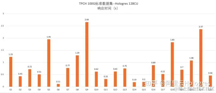下图为 Hologres 128C 实例下,TPCH 100G 标准数据集下的测试结果,横轴表示 query,纵轴是响应时间: