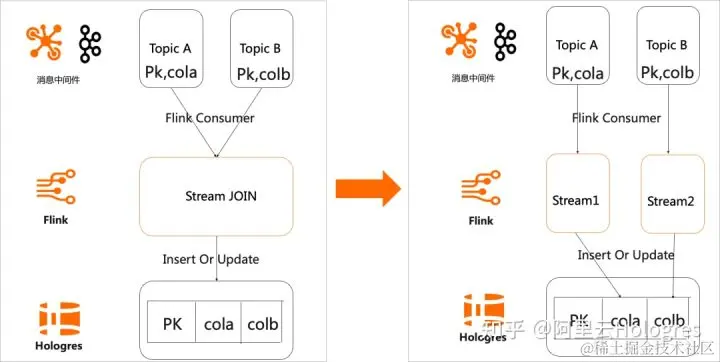 使用 Hologres 宽表的 Merge 能力,不仅可以提升流作业的开发效率,还能减少流作业所需要的资源消耗,也能够更容易的维护各个流作业,让作业之间不会相互影响。但需要注意的是,宽表 Merge 仅限于使用在主键关联的场景,并不适用于数仓中常见的星型模型和雪花模型,所以在大部分场景仍需使用 Flink 的双流 Join 来完成宽表建模。