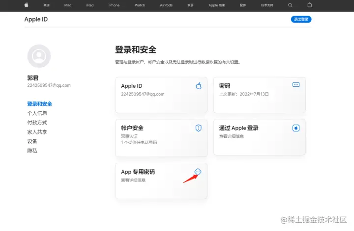 假如你还没有设置专用密码,可以在苹果开发者中心的下图的这个地方进入设置专用密码: