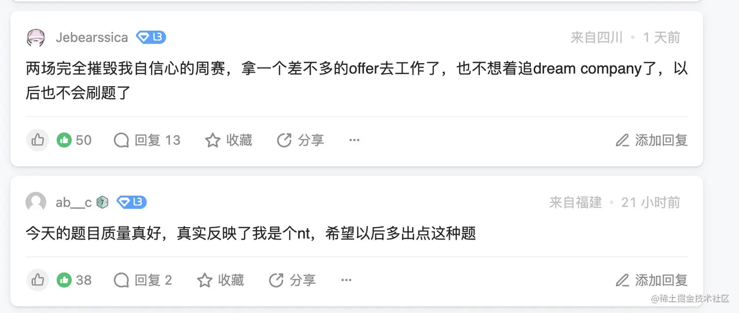 和之前相比,本次周赛的题目质量提升了不少。摘取两条评论区的精彩评论: