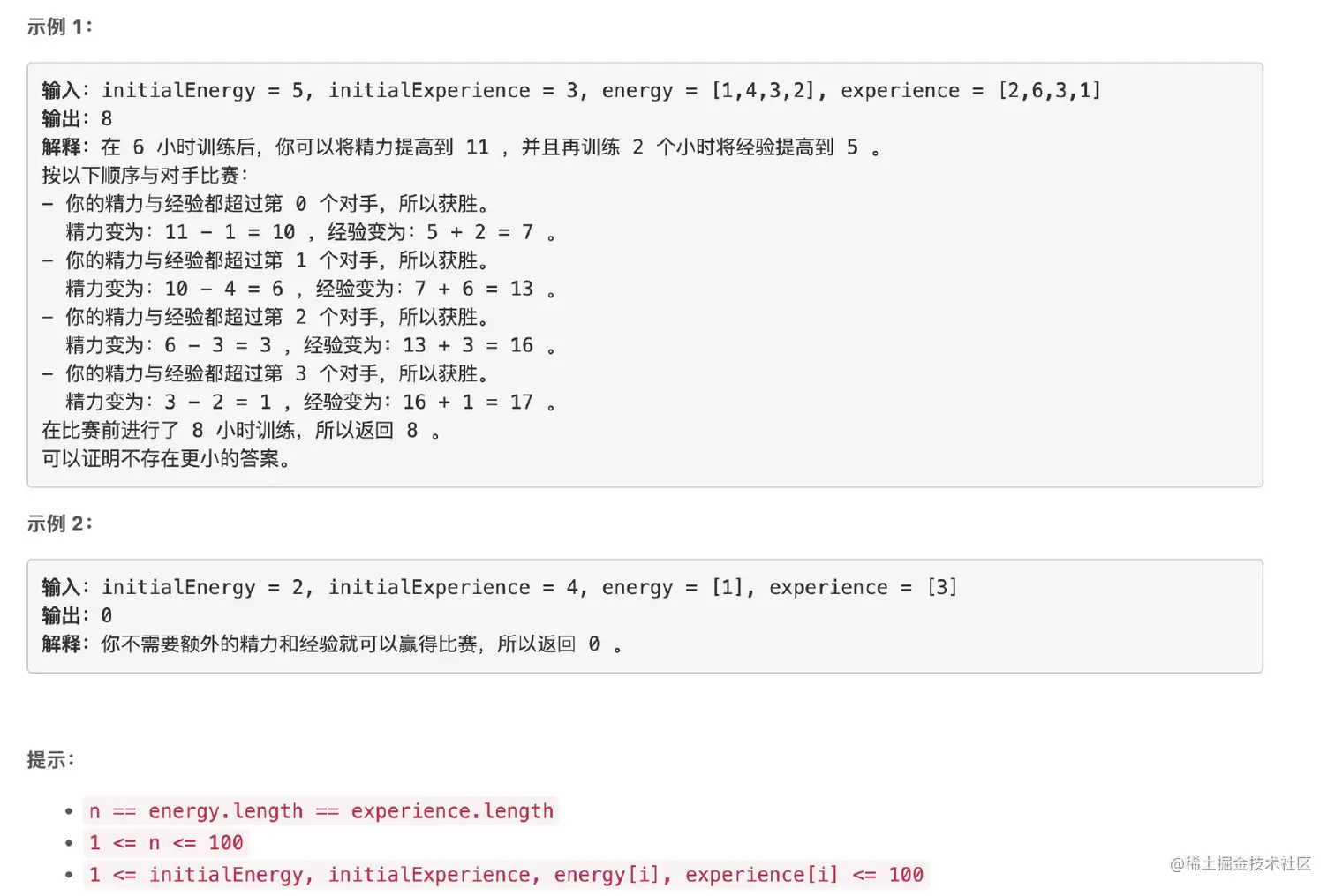 你将会 依次 对上 n 个对手。第 i 个对手的精力和经验分别用 energy[i] 和 experience[i] 表示。当你对上对手时,需要在经验和精力上都 严格 超过对手才能击败他们,然后在可能的情况下继续对上下一个对手。