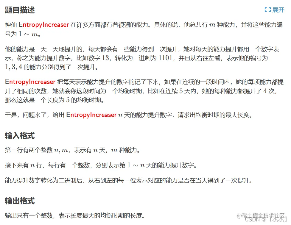 有n天,m种能力,每天给你一个数x,每天提升的能力用该数的二进制表示,1为提升,反之则不,问你最长的连续几天提升的每种能力相同的天数。