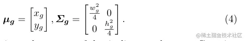 观察到物体的主体聚集在边界框的中心,作者还将ground truth框(xg、yg、wg、hg)建模为标准的二维高斯分布Ng(µg,∑g),其中每个带注释框的中心点用作高斯的平均向量,半边长的平方用作协方差矩阵,即,