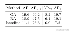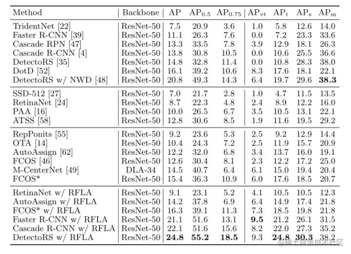 作者将作者的方法与AI-TOD基准上的其他最先进检测器进行了比较。如表5所示,带RFLA的探测器达到24.8 AP,比最先进的竞争对手高出4.0 AP。