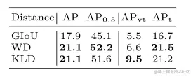 如表1所示,可以看出,GIoU不如RFD,因为它无法区分相互包容的盒子的位置,而WD和KLD的性能相当。