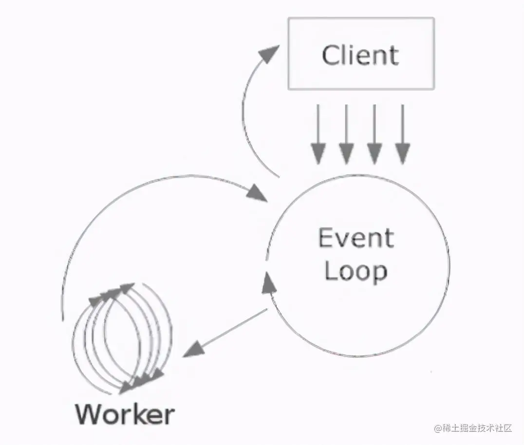 图3-11所示是事件循环的工作示例。事件循环器不断接受来自客户端(Client)的请求,并把请求转交给注册了某类事件的工作线程(Worker)处理。