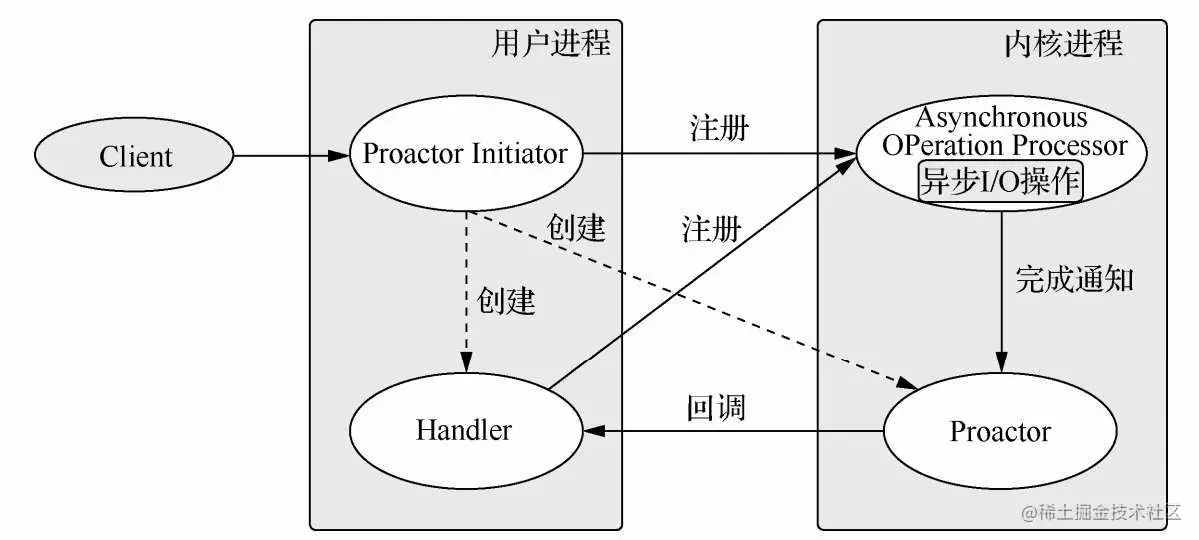 ·应用程序初始化一个异步读取操作,然后注册相应的事件处理器,此时事件处理器不关注读取就绪事件,而是关注读取完成事件,这是区别于Reactor的关键。