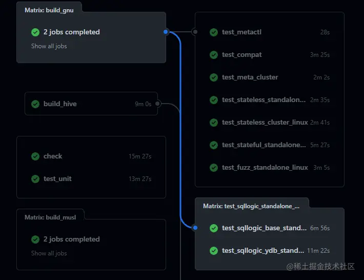 当提交一个 PR(Pull Request)到 Databend 仓库时,会触发一系列的流水线;当构建部分完成后,会进入测试的部分。流水线会将构建产物在一个全新的环境上运行起来,同时执行各项测试,sqllogictest 是其中的一个重要环节。如图:只有当所有的测试都通过后,该提交才能合并到主干,保证了每次修订不会影响功能预期,而我们需要做的就是完善用例、提示用例的覆盖率。