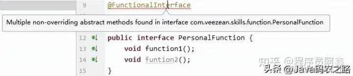 我们自己定义一个函数式接口,里面提供两个抽象方法测试一下,会发现IDEA中直接就提示编译失败了: