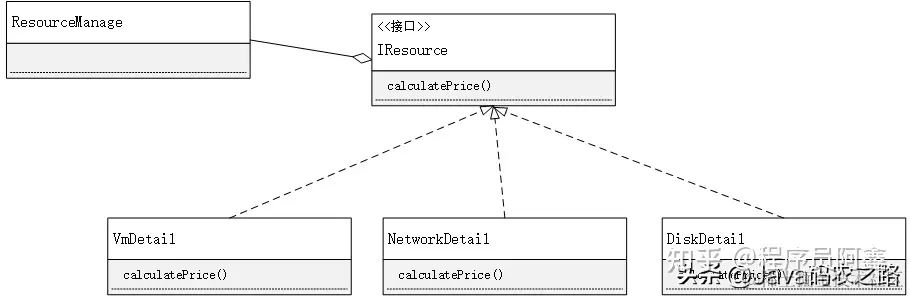 那按照常规的思路,我们要将定制逻辑从公共逻辑中剥离,会定义一个接口类型,要求不同资源实体类都继承此接口类,实现接口类中的calculatePirce方法,这样在平台通用计算逻辑的时候,就可以通过泛型接口调用的方式来实现我们的目的: