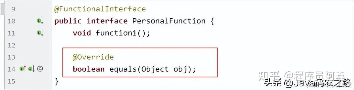 原来,这个 equals方法,其实是继承自父类的方法,因为所有的类最终都是继承自Object类,所以 equals方法只能算是对父类接口的一个覆写,而不算是此接口类自己的抽象方法,所以此方法里面实际上还是只有 1个抽象方法,并没有违背函数式接口的约束条件。