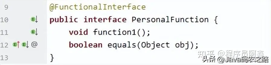 同样是这个自定义的函数式接口,我们修改下里面的抽象方法名称,改为 equals方法,会发现这样就不报错了: