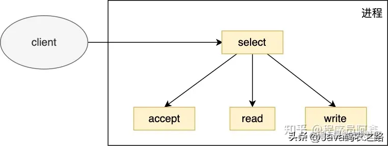 主要流程如下:调用 select 来监听连接,读写事件,收到事件后判断是否是监听 socket 上的事件,是的话调用 accept(),否则判断是否是已连接 socket 上的读写事件,是的话调用 read(),write()