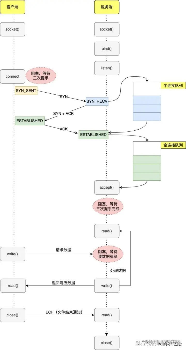 - server 准备好后,client 也创建 socket ,然后执行 connect 向 server 发起连接请求,这一步会被阻塞,需要等待三次握手完成,第一次握手完成,服务端会创建 socket(这个 socket 是连接 socket,注意不要和第一步的监听 socket 搞混了),将其放入半连接队列中,第三次握手完成,系统会把 socket 从半连接队列摘下放入全连接队列中,然后 accept 会将其从全连接队列中摘下,之后此 socket 就可以与客户端 socket 正常通信了,默认情况下如果全连接队列里没有 socket,则 accept 会阻塞等待三次握手完成