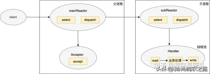 - 主进程主要负责 accept 连接,接收后会将其传给 subReactor,subReactor 将其连接加入连接队列中来监控其事件