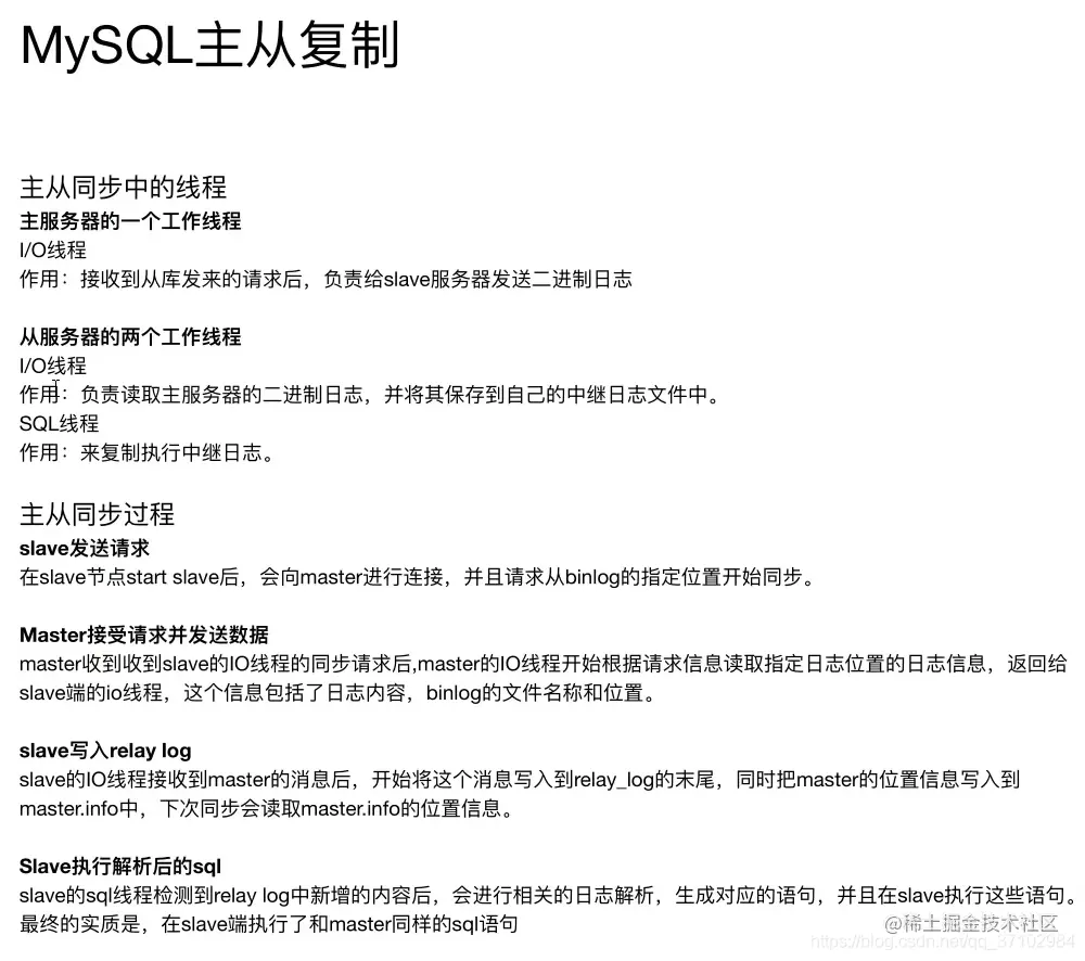 - MySQL主从复制:MySQL Replication在Master端开启binlog,master把它的二进制日志传递给slaves来达到master-slave数据一致的目的