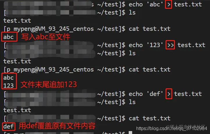 第1句命令,会创建test.txt文件,并将abc写到文件中;