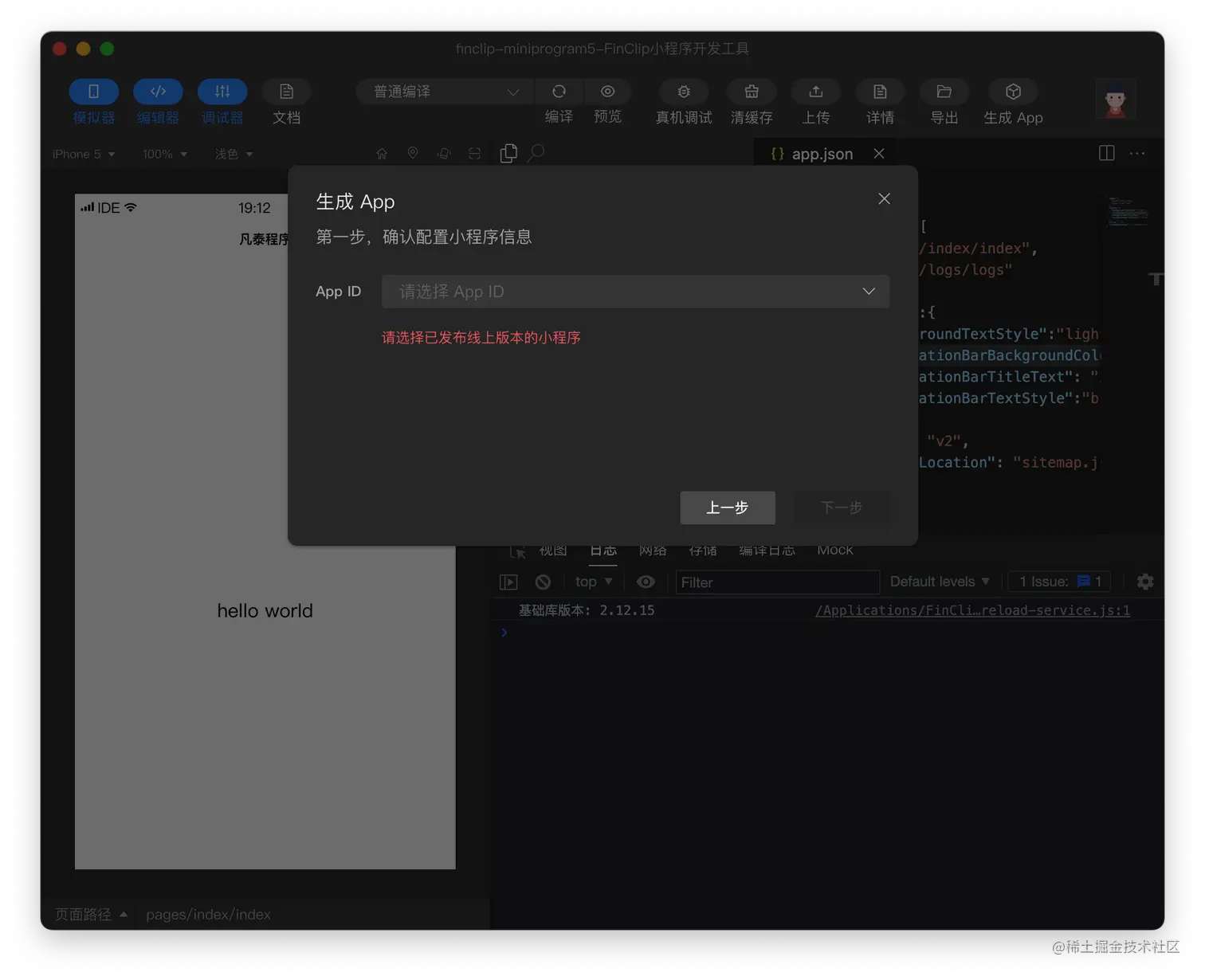 在打开了小程序的页面后,可以点击右上角的「生成 App」按钮,并点击页面中的「下一步」开始后续流程。