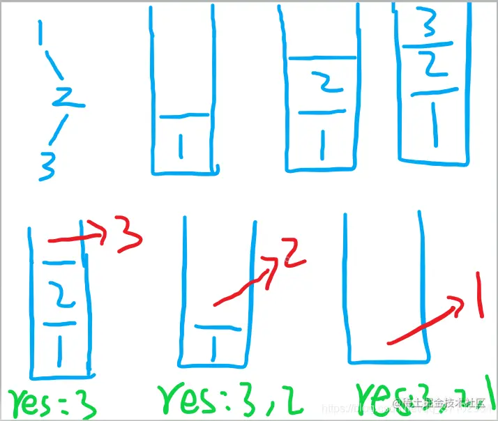 - 同理可得,结果数组更新为 res={3,2,1} ,1出栈且置空。