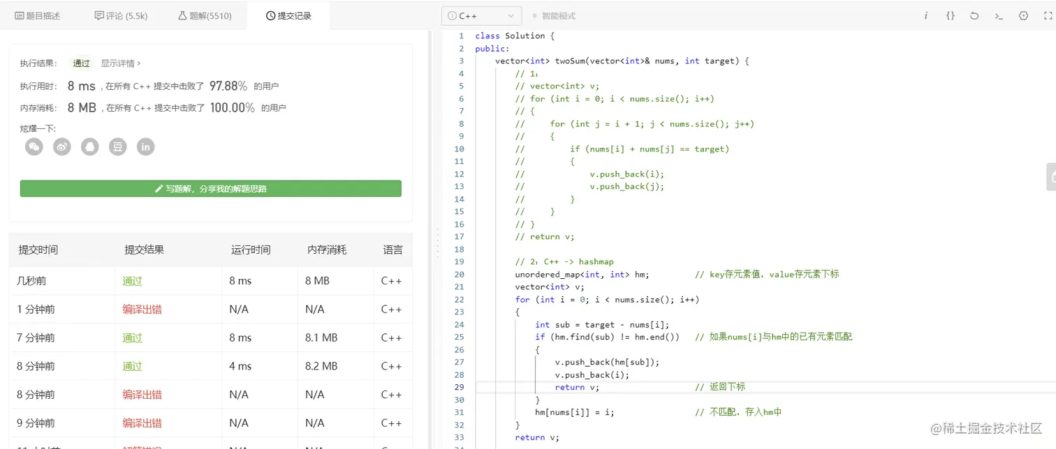 注意这里的 hm 中:key存数组元素的值,value存数组元素的下标