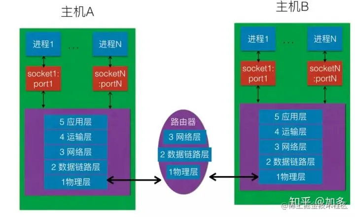 如上图主机A和B上面有好多进程,比如QQ进程,手淘进程,微信进程,浏览器进程等等。