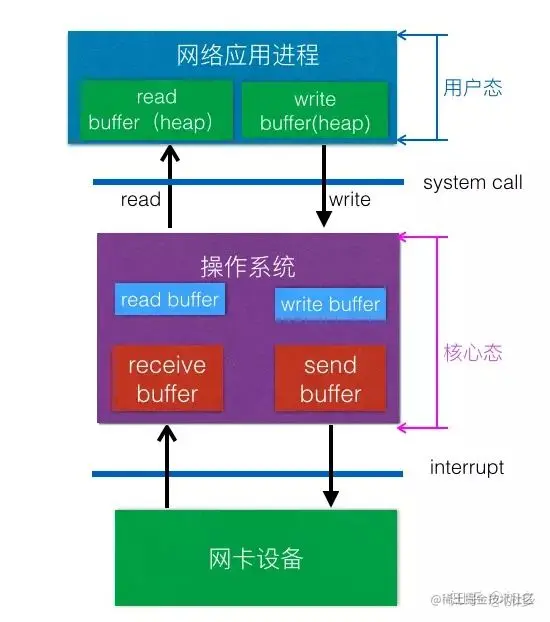 如上图当网络应用进程向socket写入数据时候,首先需要在应用程序内申请一个写buffer,然后把数据写入到写buffer,然后应用程序的执行会用用户态切换到核心态,核心态程序把应用程序写buffer里面的数据拷贝到操作系统层面的写缓存里面。当应用程序读取数据时候是需要把操作系统层面的读buffer里面的数据拷贝到应用程序层面的读buffer里面。一般情况下应用程序层面的buffer都是从堆空间里面申请的,这就需要在用户态和核心态之间数据传输时候进行一次数据copy。这是因为核心态是不能直接应用程序堆内存的,必须转换为直接内存。