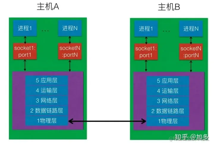 网络通讯的本质用一句话来说是处于两个主机上的两个进程之间进行通讯,如下图: