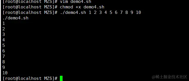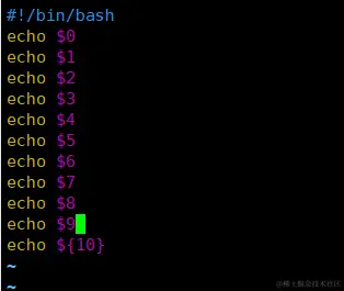 0代表命令本身,1~9代表第一个到第九个参数,十以上的参数需要使用大括号表示,比如第十个参数为 ${10}