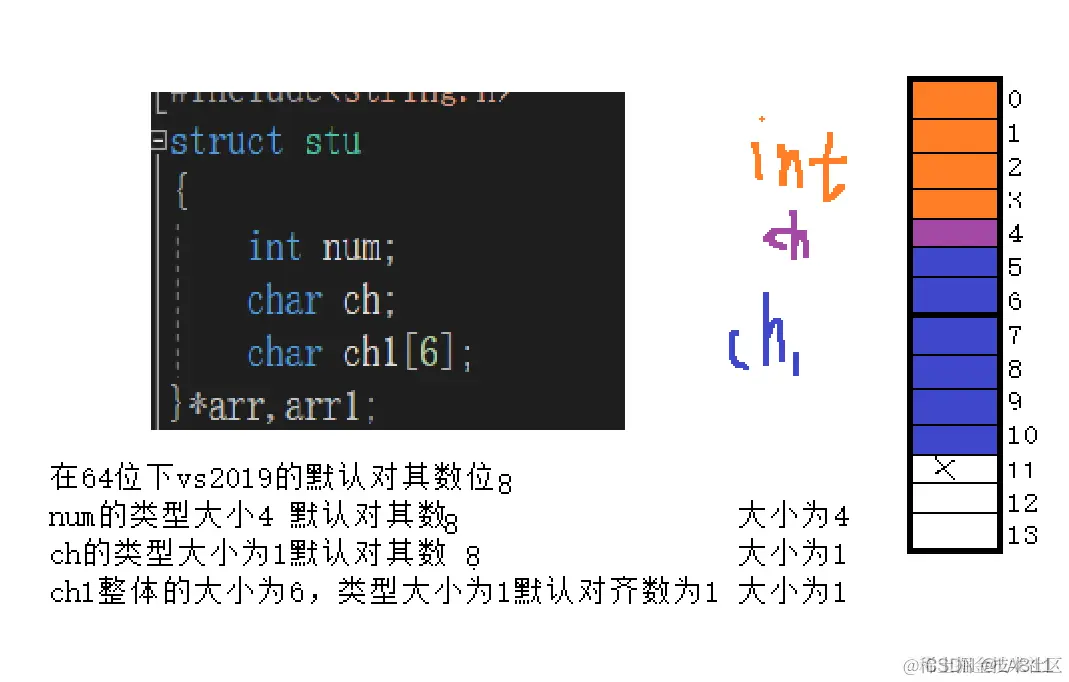 结构体的大小要结合各个元素的类型大小和默认对其数取其最小值为对其数比如ch的类型大小小于默认对齐数所以取大小1并在1的倍数位置上开始往下分配内存,并且整个结构体的内存结尾实在最大的大小(在所有元素内存分配完成)的最小倍数处停止 。