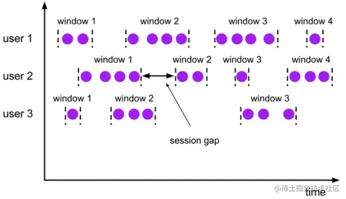 - 会话窗口:参数为超时时间session gap,如果相邻两个数据的时间间隔大于session gap,就关闭之前的窗口,新开一个窗口,因此,有些窗口的数据可能很多,因为在那个时间点连续不断地有数据进来,这些数据都属于同一个窗口。会话窗口在处理乱序数据的时候很麻烦,还涉及到多个窗口的数据合并。