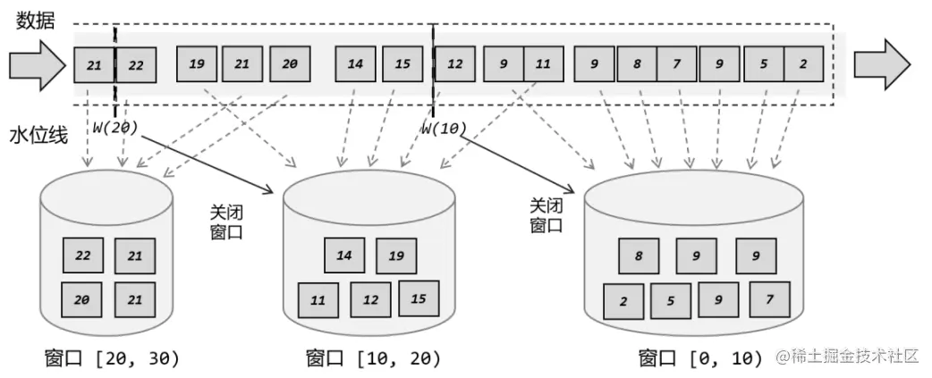 通常是按照事件时间划分数据到对应的window中。window有起始时间和结束时间,程序根据watermark判断一个window是否要关闭,当watermark大于结束时间就触发这个window,对window内的数据进行聚合计算(例如求和),发到下游任务,并关闭该window。