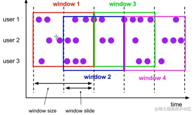 - 滑动窗口:比滚动窗口多了一个参数步长window slide,表示多久滑动一次,此时window的计算频率由滑动步长决定,滑动一次就触发一次计算,窗口的大小决定了计算数据的范围。滚动窗口是特殊的滑动窗口,其滑动步长为窗口大小。