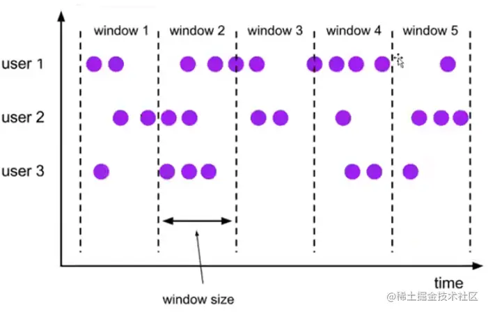 - 滚动窗口:对数据进行均匀切片,窗口之间没有重叠,也就是说数据最多只落入一个窗口里面。最普遍的一种窗口,只有一个参数window_size,例如5分钟、1小时。。